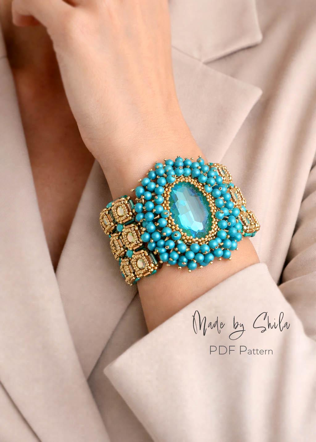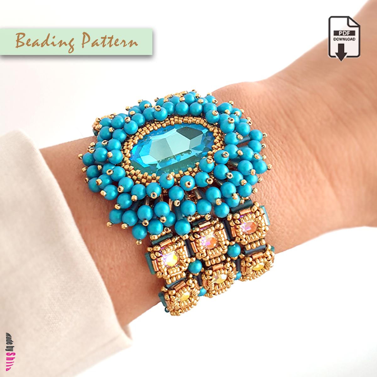 Create a stunning crystal statement bracelet and matching earrings with this beautifully detailed beadwork pattern.