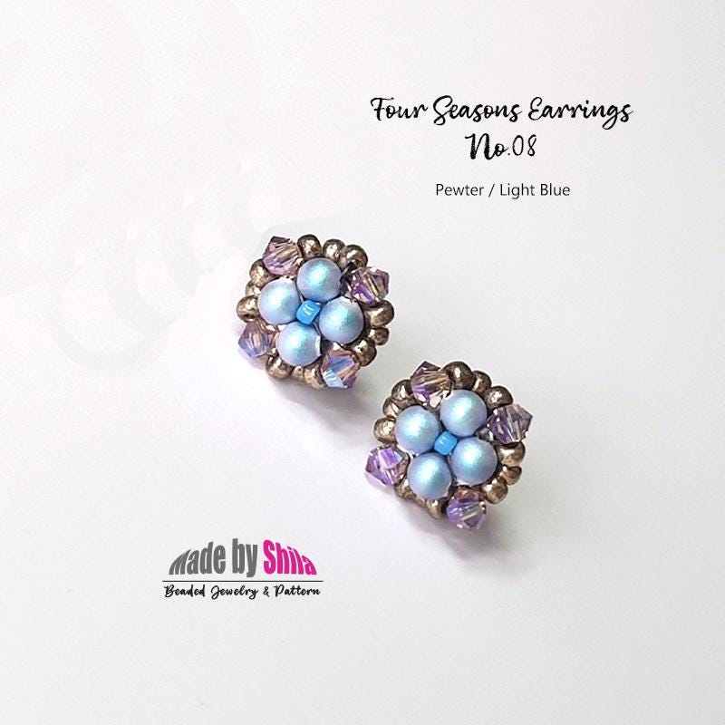 This digital beading pattern features four pearls accented with crystals, woven together using a modified Cubic Right-Angle Weave (CRAW) technique. The ear post is neatly hidden within the design, and the pattern can easily be adapted for ear wires by adding a simple beaded loop.