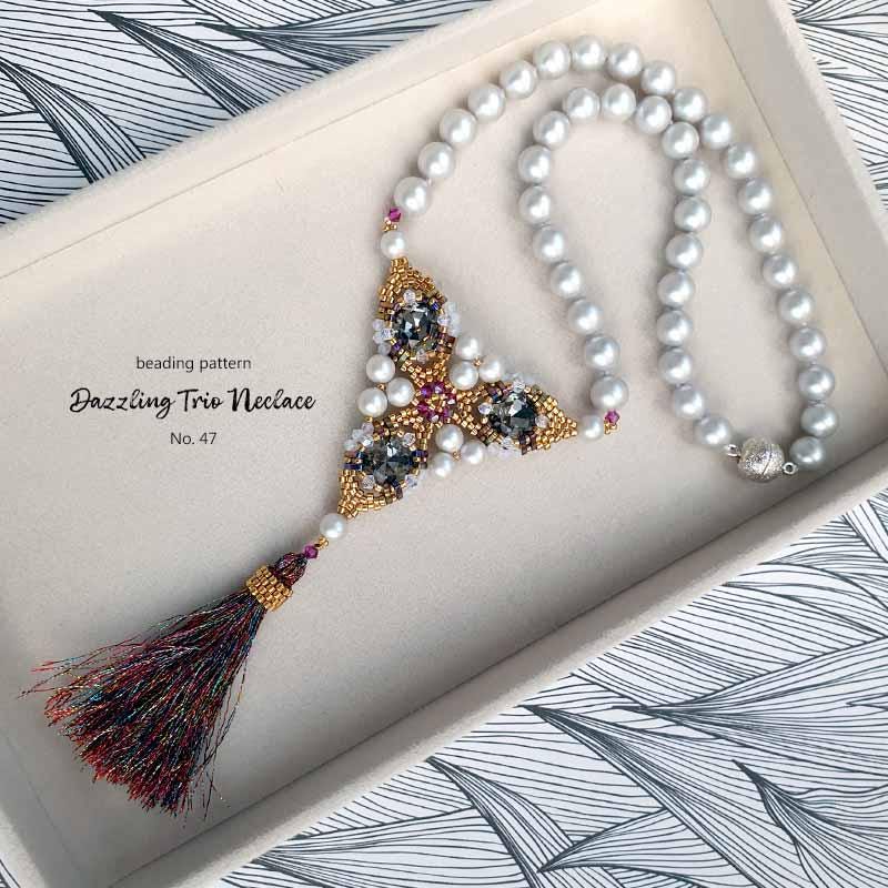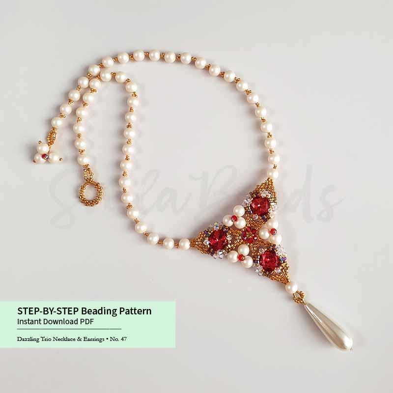 📿 The petals are connected with Delica beads at the center, while three pearls link the sides of each motif. The necklace is primarily constructed using crystal pearls; in the rose version, these pearls are connected with three seed beads for a delicate transition.