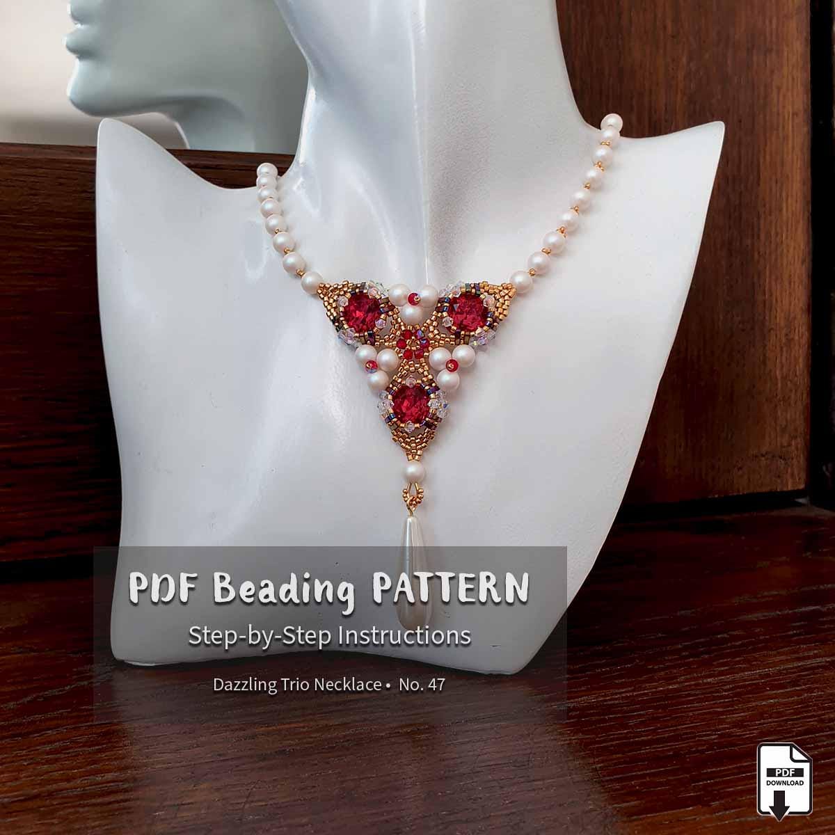 ✨ This elegant statement necklace features a rich combination of seed beads, Delica beads, Quarter Tila beads, crystal bicones, and pearls. At the center of the design are striking 12 mm crystal square cabochons, beautifully framed in peyote stitch settings. Each floral element is finished with a pearl accent on top, creating a refined and dimensional look.