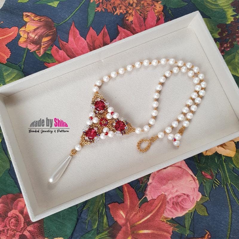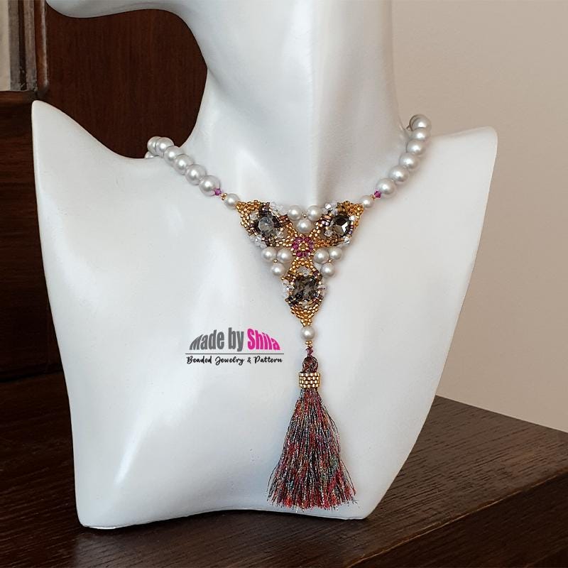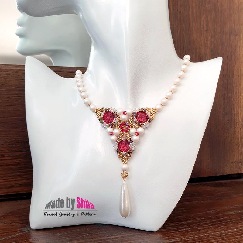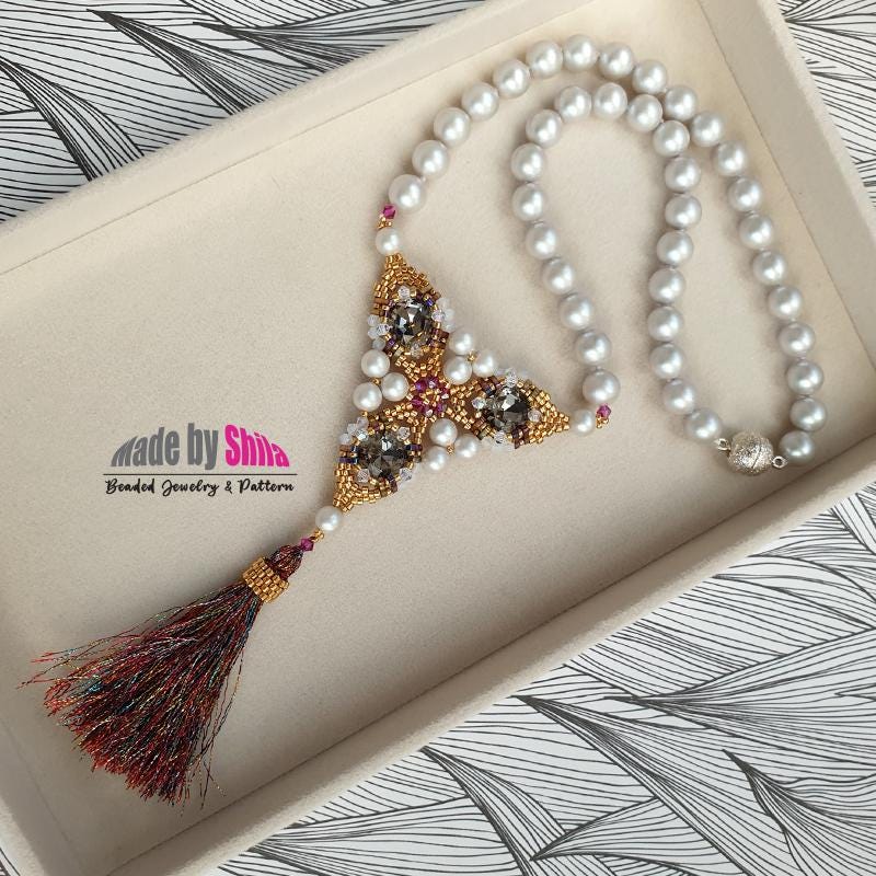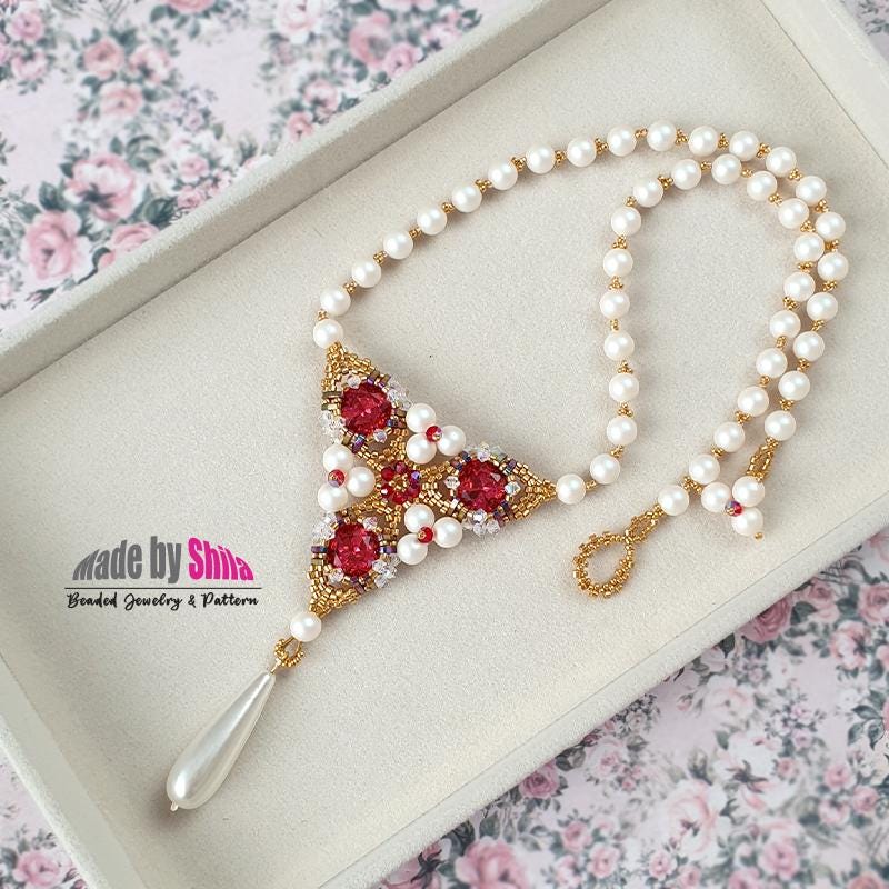 ★★★ The necklace created a combination of seed beads, delica beads, quarter Tila beads, crystal bicones and pearls. At the center of the design are 12 mm crystal square cabochons, set in peyote settings. Each petal is decorated with a pearl on the top. They are connected by delicas in the middle, and three pearls connect the sides of these elements. The necklace is made from crystal pearls, and in the rose version, these beads are linked by three seed beads. The length of the necklace can be easily adjusted by adding more pearls and seed bead links. It closes with a beaded clasp, but this can be replaced with any clasp of your choice. Additionally, the component can be created into unique earrings. ★★★