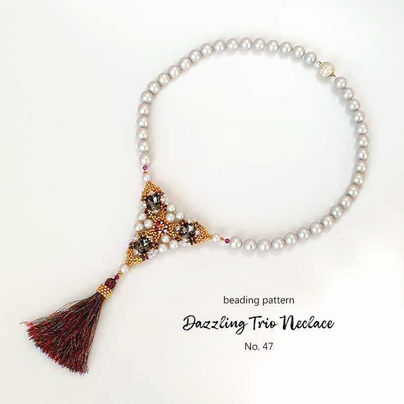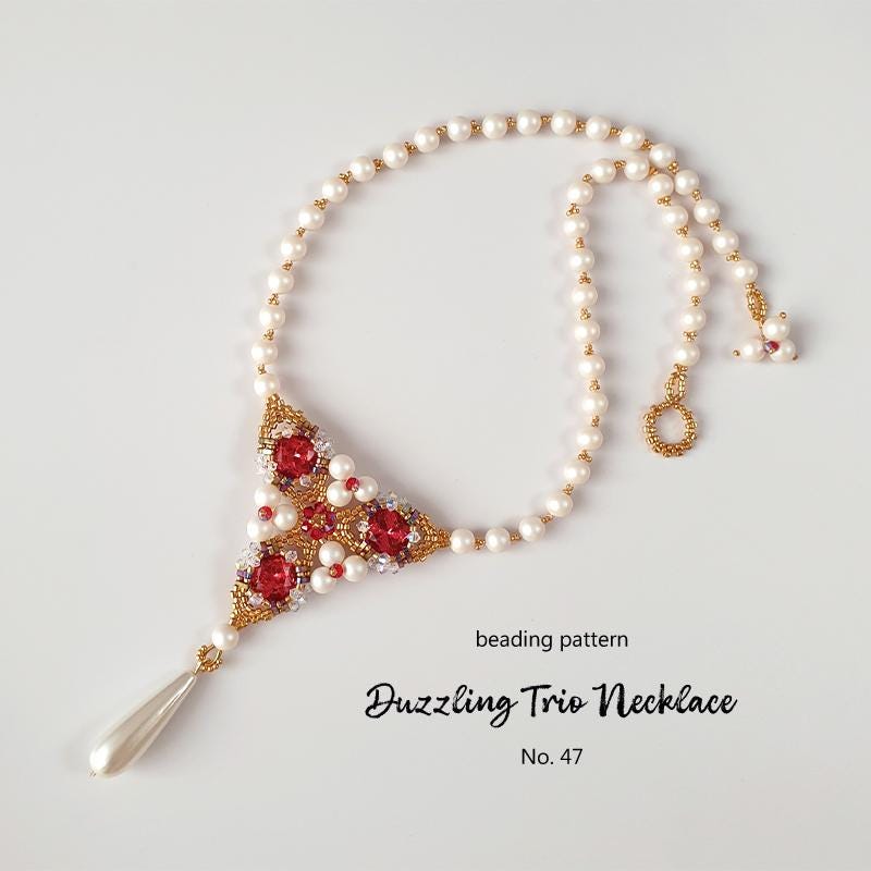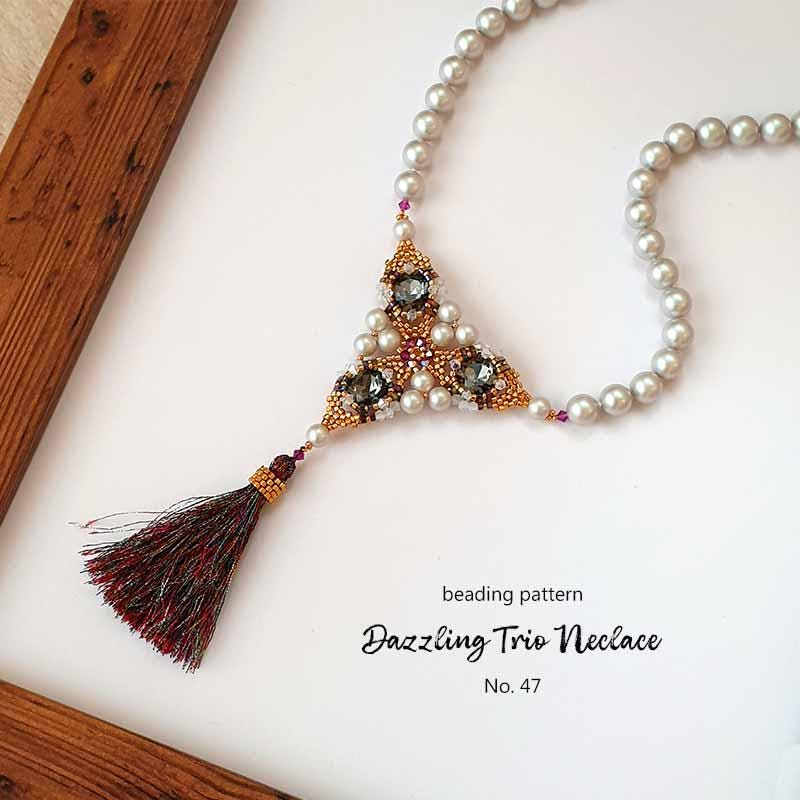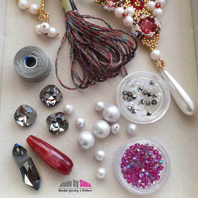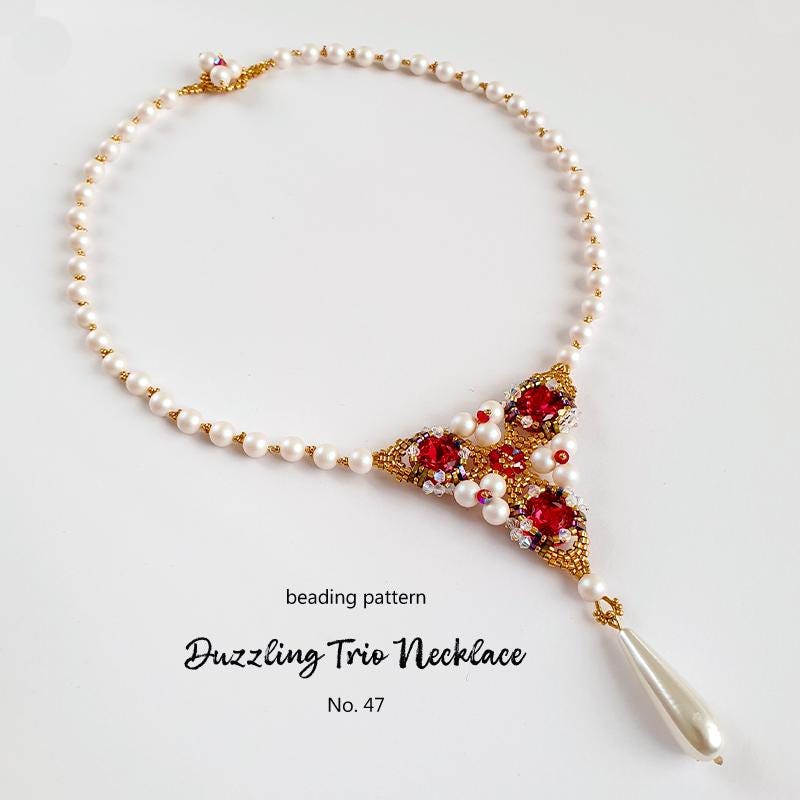 ★★★ The necklace created a combination of seed beads, delica beads, quarter Tila beads, crystal bicones and pearls. At the center of the design are 12 mm crystal square cabochons, set in peyote settings. Each petal is decorated with a pearl on the top. They are connected by delicas in the middle, and three pearls connect the sides of these elements. The necklace is made from crystal pearls, and in the rose version, these beads are linked by three seed beads. The length of the necklace can be easily adjusted by adding more pearls and seed bead links. It closes with a beaded clasp, but this can be replaced with any clasp of your choice. Additionally, the component can be created into unique earrings. ★★★