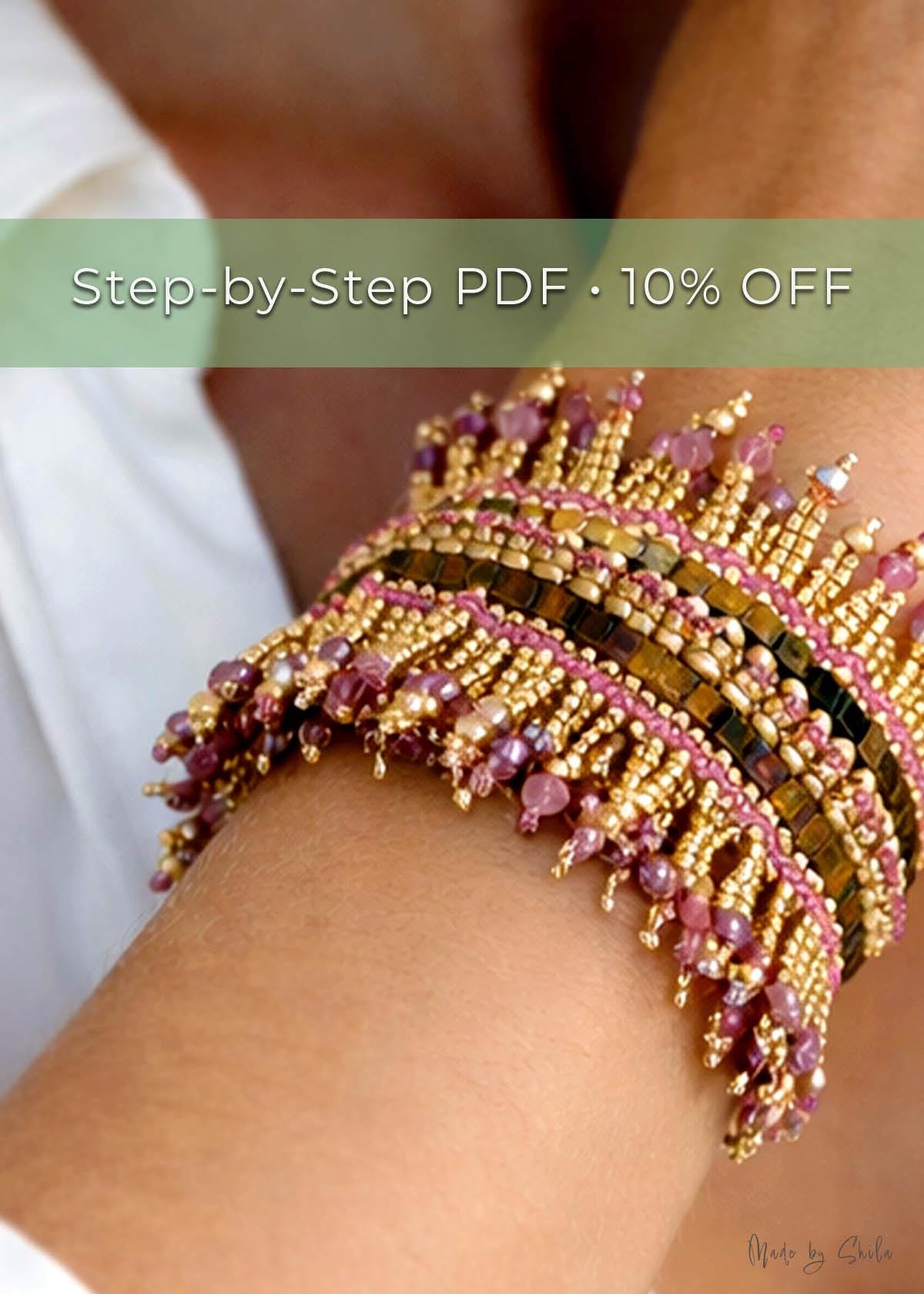 This DIY jewelry pattern includes instructions for both the bracelet and matching earrings, allowing you to create a complete handmade jewelry set.