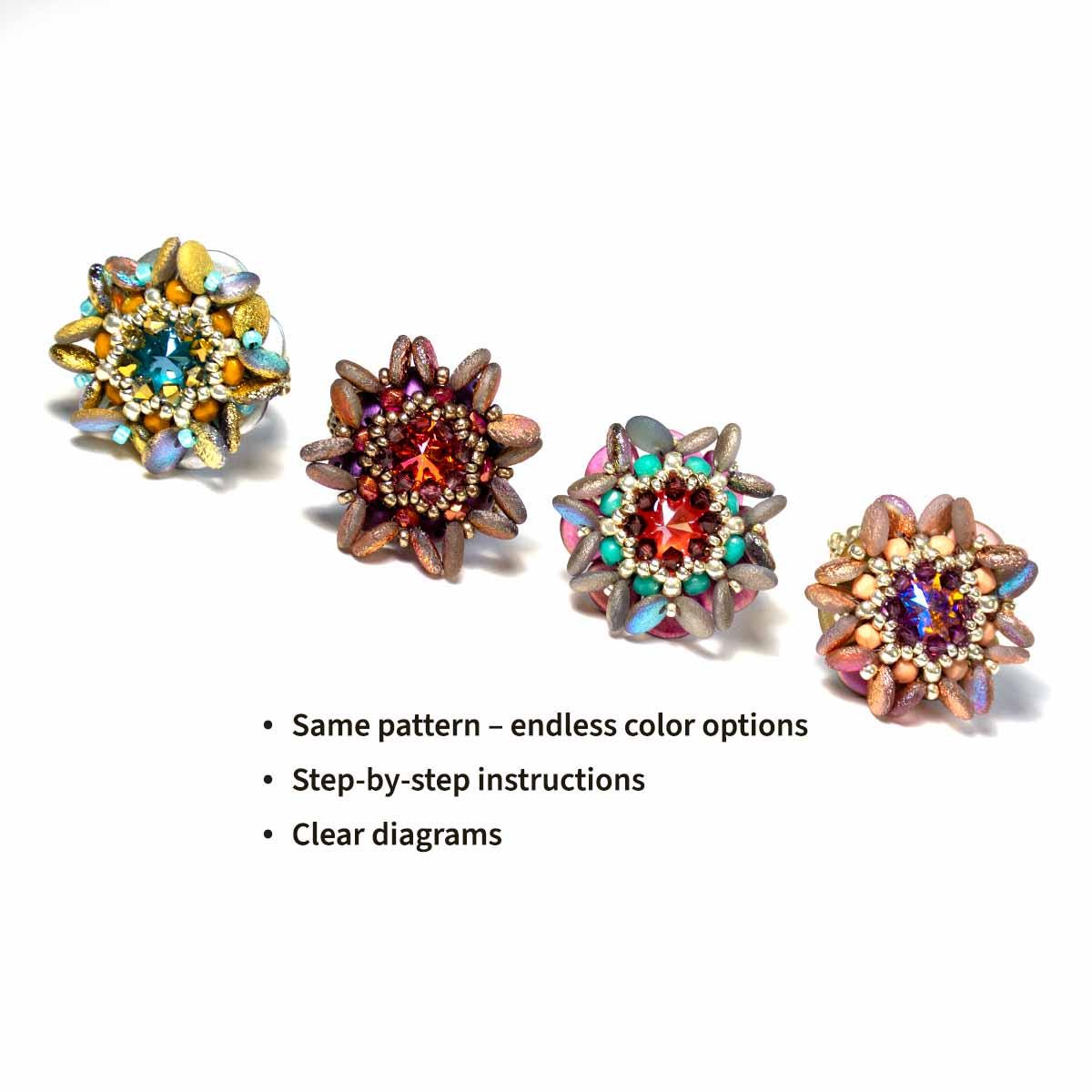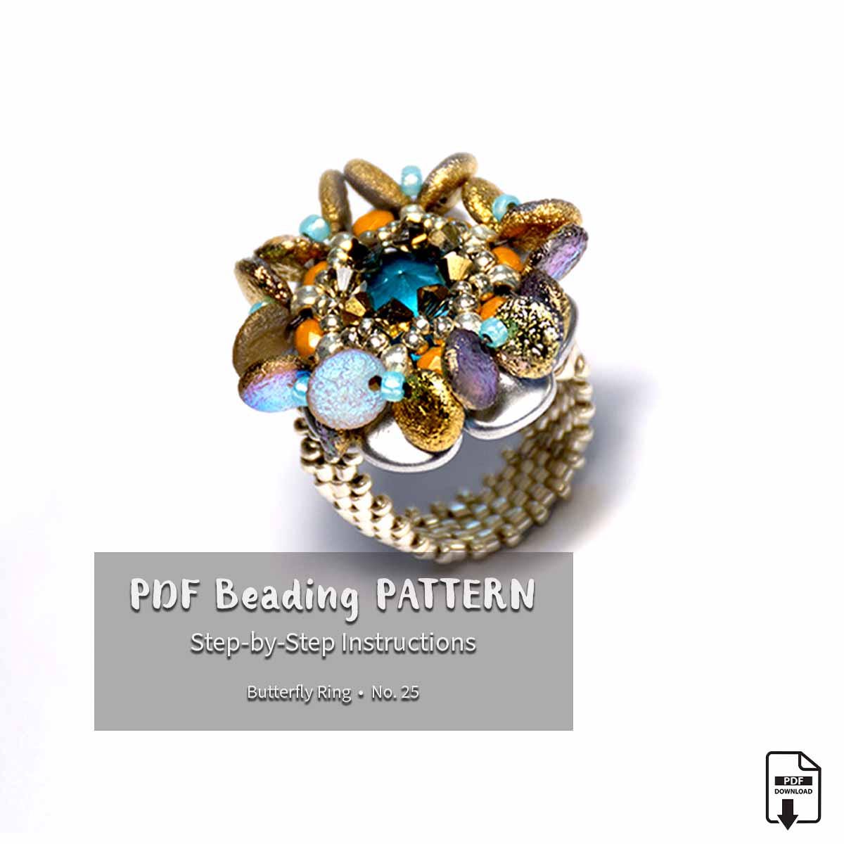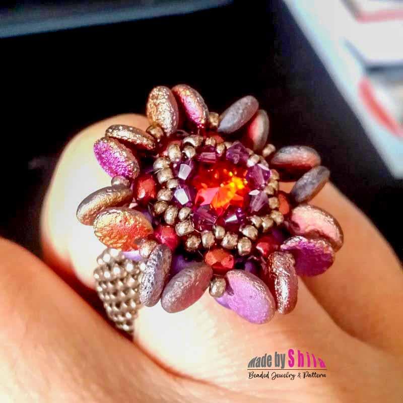 You will need for the ring: seed beads (15/0, 11/0, 8/0, 6/0), delica beads (11/0), crystals bicone 3mm, rivoli 12mm, lentil beads top drilled 6mm, firepolished beads 3mm.