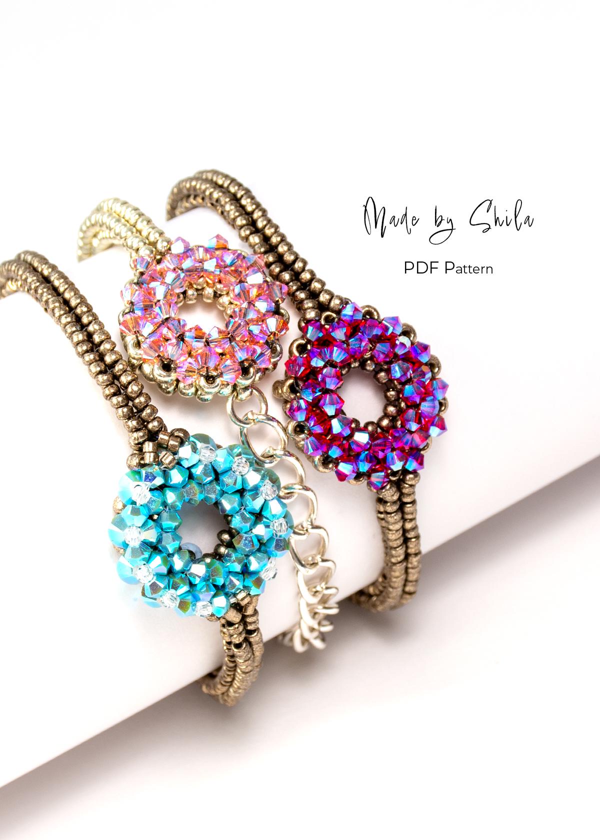 ✨ This PDF pattern of geometric CRAW round shape piece can be incorporated into a variety of designs. You can embellish it with different shapes of crystals or pearls, selecting vibrant or harmonious color combinations that match your style. Feel free to attach any beaded strips you like, arrange several round motifs in a row, or layer multiple bracelets on your arm for a unique look.