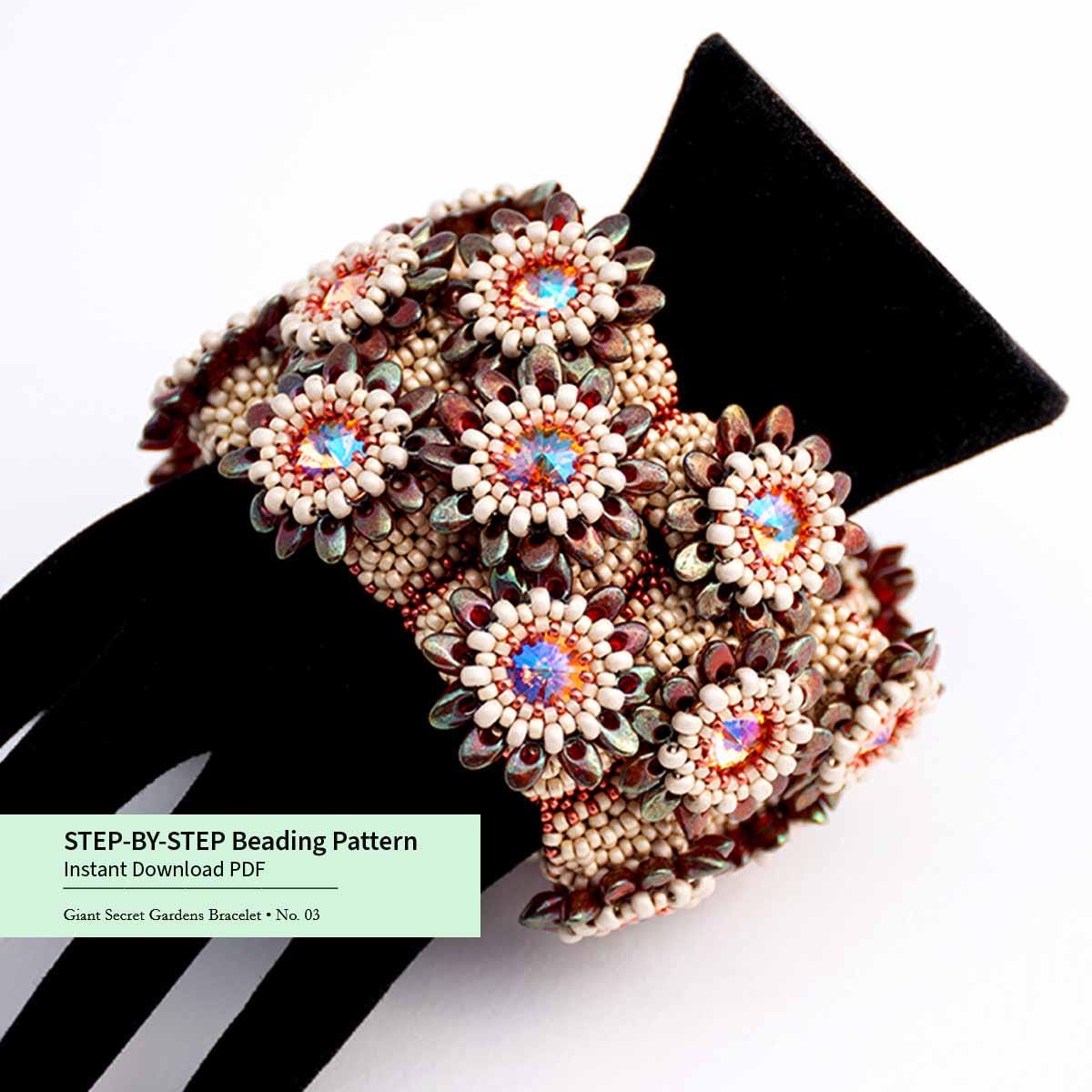 ★★★ I would like to present one of the largest bracelets of my designs, the Giant Secret Gardens bracelet. Following the step-by-step instructions, you can easily make the bracelet - see in the main picture - of your favorite colors of beads and crystals! The tutorial is fourteen A4 pages with step-by-step instructions and detailed graphic illustrations. ★★★